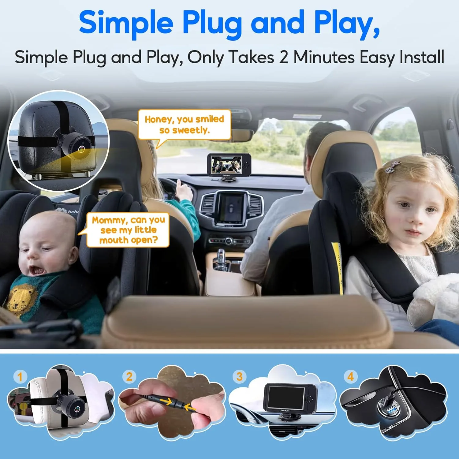 Absolutely! One of the biggest advantages of this camera is its ‘USB Plug & Play’ design, which means installation takes less than two minutes. You don’t need any special tools or complicated wiring. Simply attach the monitor to your windshield or dashboard with the suction cup, secure the camera to a headrest using the adjustable velcro strap, and plug the cable into your car’s cigarette lighter or USB port. It’s designed for maximum convenience, letting you get on the road quickly and confidently.
