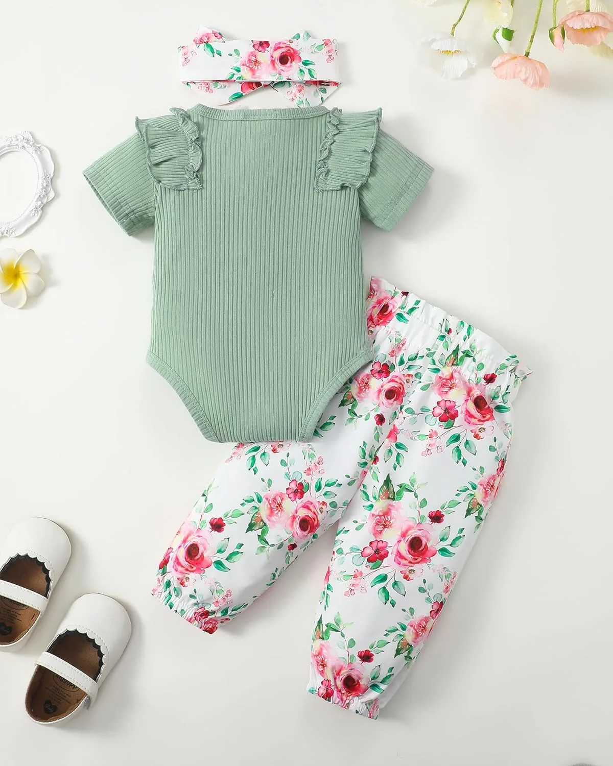 Yes, the package comes as a complete and coordinated set, ensuring your baby is stylishly dressed from head to toe. You will receive 1 x baby girl ruffle short sleeve romper top, 1 x baby girl floral print pants, and 1 x matching baby girl headband. This complete ensemble takes the guesswork out of styling, providing an effortlessly adorable look right out of the box.