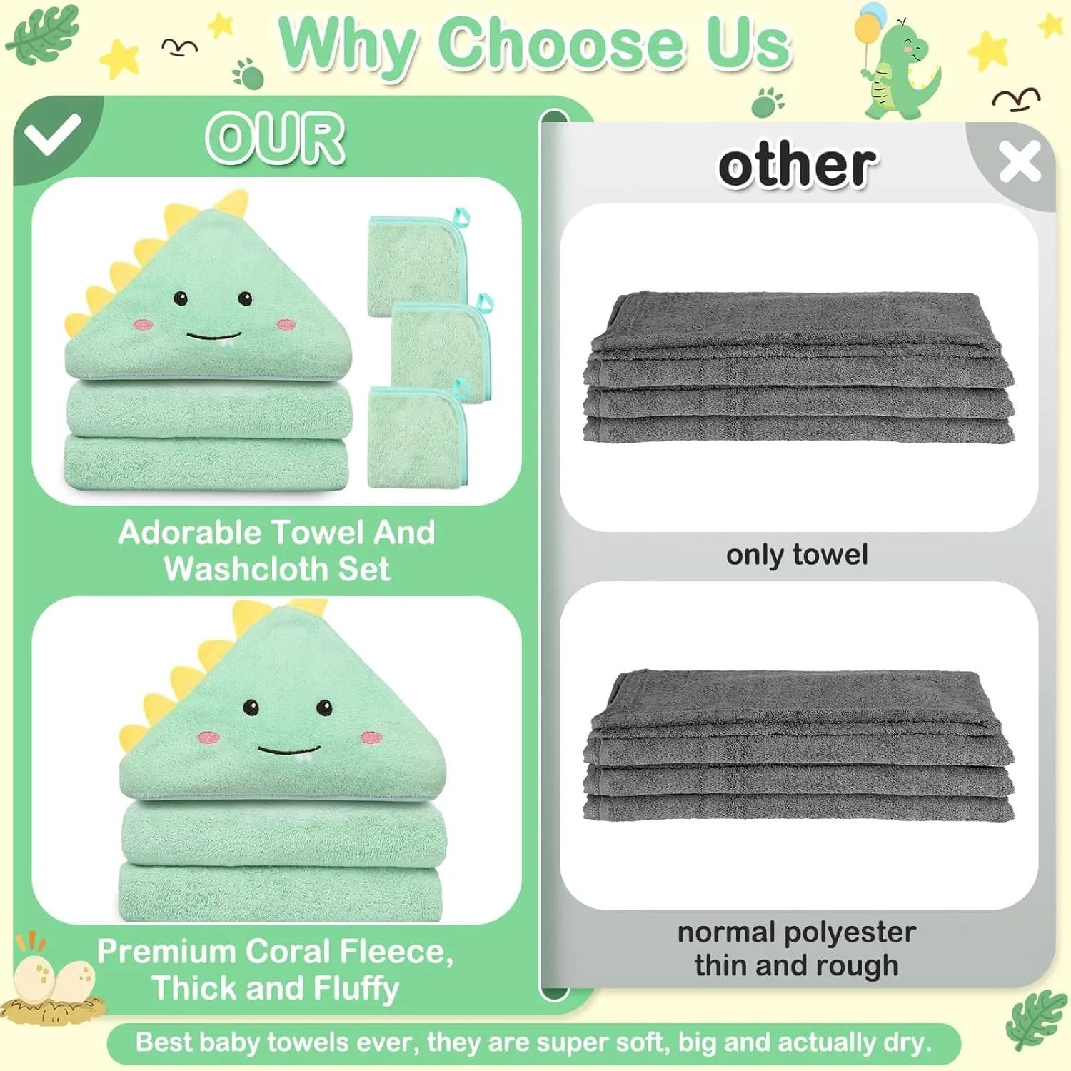 And, of course, the charming green dinosaur design is an absolute hit! Many parents have shared how their children are captivated by the playful character, making bath time something they eagerly anticipate. “My little one loves becoming a dinosaur after his bath!” is a common sentiment, reflecting the joy and imagination this simple design sparks. It’s more than just a towel; it becomes a cherished part of their daily routine, a fun friend that turns a necessity into a delightful ritual. The perfect sizing for various ages, from newborns to active 5-year-olds, and the unexpected versatility of the included washcloths for everything from burp cloths to quick clean-ups, also contribute to the overwhelming sentiment that this set is a thoughtful, practical, and truly appreciated addition to any family’s life, whether as a personal purchase or a truly special gift for expectant parents.