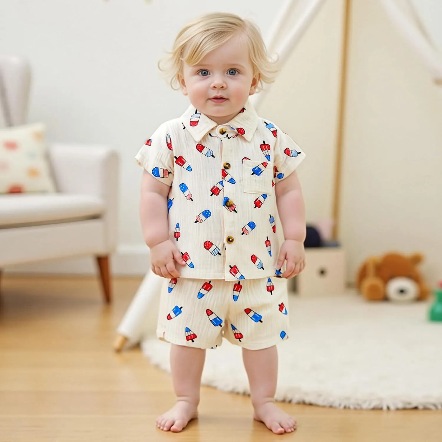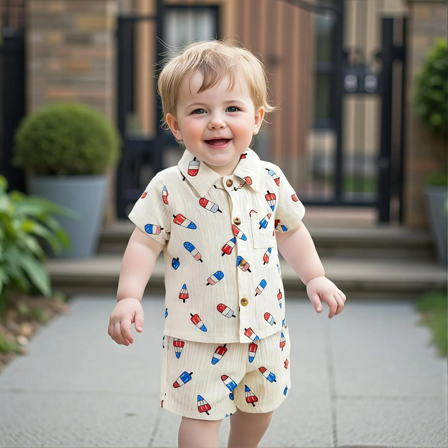 We understand that as a parent, you have questions about the products you choose for your child. Here are some common queries about the Toddler Boy 4th of July Popsicle Muslin Button Down Shirt and Shorts Set, designed to give you peace of mind: