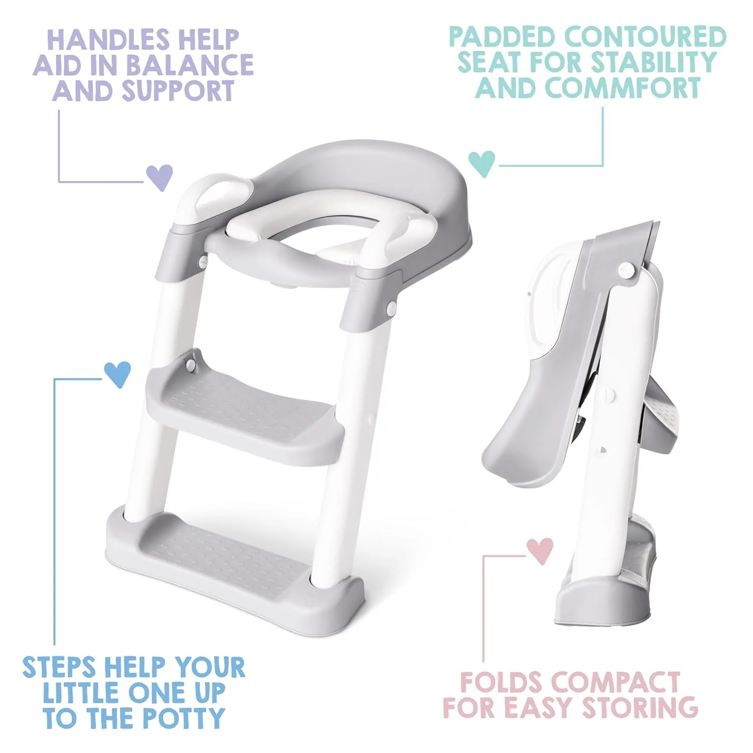 Comfort is key, and this trainer delivers with a soft, cushioned, and contoured seat. Say goodbye to cold, hard plastic that makes them fidget and want to jump off. This seat is designed to fit little bottoms perfectly, making potty time a comfortable and inviting experience, encouraging longer, more successful sits. When it’s comfortable, they’re more likely to relax, focus, and associate potty time with a positive, pleasant feeling rather than discomfort or impatience.