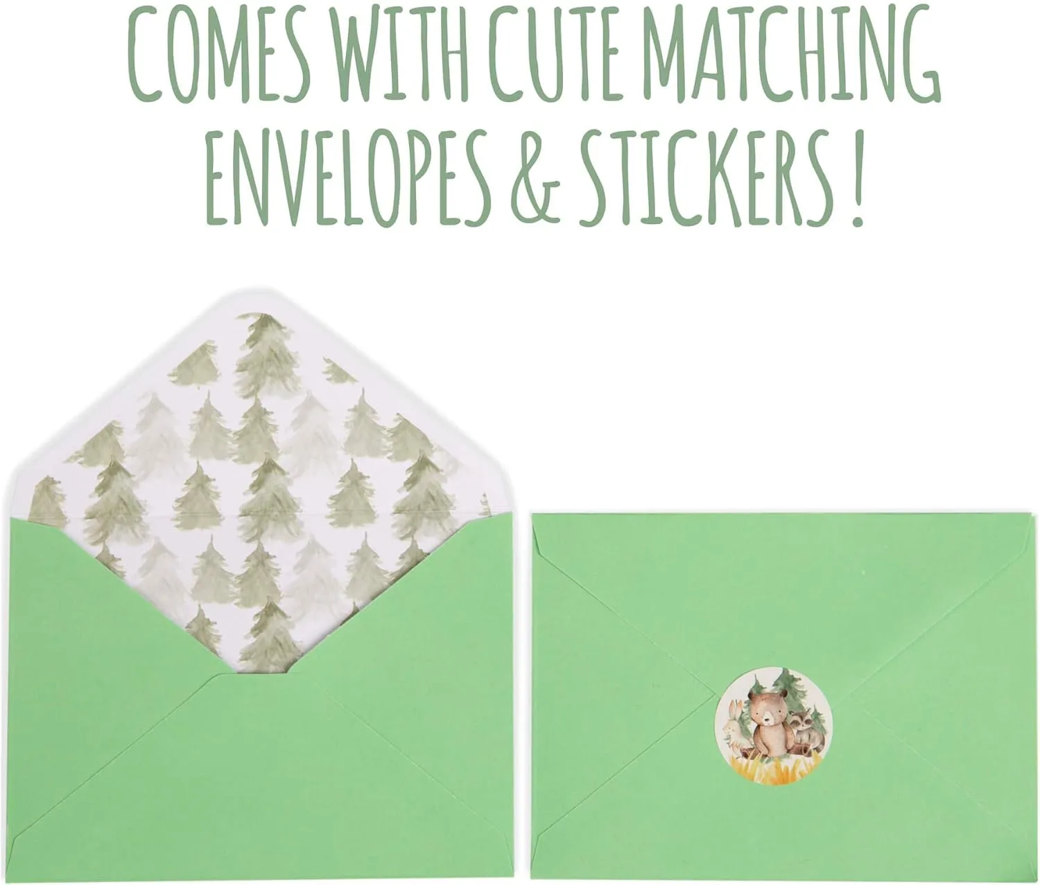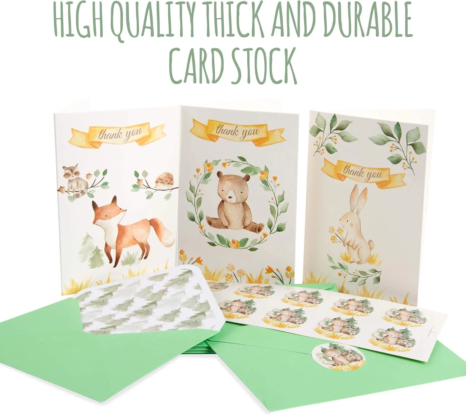 Yes, they do! Each set of 30 thank you cards comes complete with matching green envelopes. These envelopes feature a lovely forest-themed interior, adding an extra touch of charm and ensuring a cohesive look with the woodland cards. Additionally, the set includes adorable sealing stickers, each featuring a different woodland creature, which not only securely seal your envelopes but also add a delightful decorative element. It’s a complete package designed for convenience and a touch of fun!
