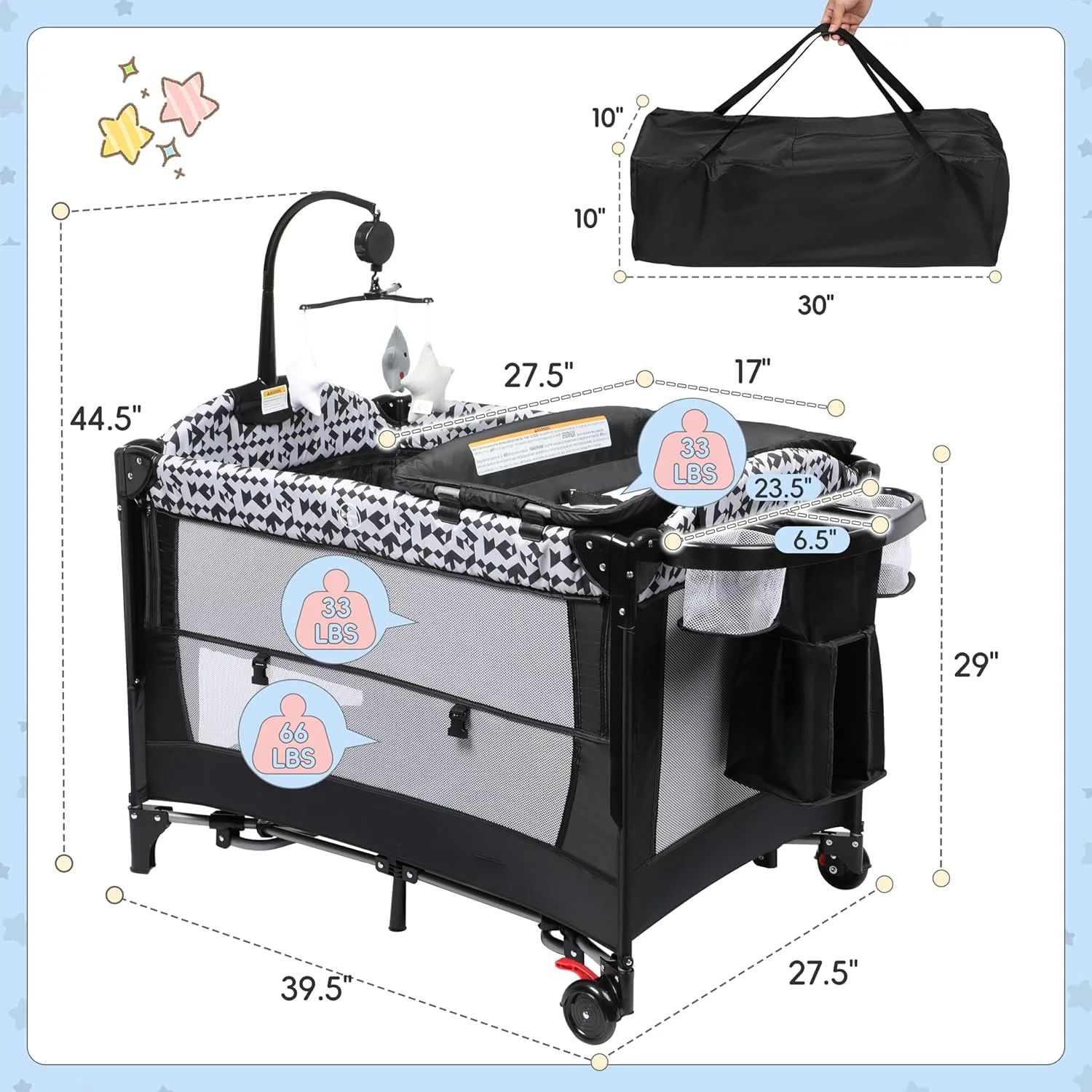 Beyond the playard, the independent Baby Crib transforms into a soothing Rocking Bassinet, complete with an enchanting music box. Whether it’s for daytime naps or a calming transition to bedtime, the gentle sway combined with sweet melodies creates a serene sanctuary, lulling your little one into peaceful slumber. And underpinning all of these wonderful features is the meticulously designed, Sturdy Bed Base. Crafted with a 3-layer structure – embracing durable Oxford fabric, high-density sponge for plush comfort, and a robust MDF board – it offers an oasis of support. The bed’s 3 strong support tubes thoughtfully distribute a weight capacity of 33LBS, ensuring an unwavering, stable foundation that promises your baby serene and secure nights. This thoughtful blend of practicality and comfort means you’re investing in a single item that evolves with your child, simplifying your home and enriching your parenting experience, providing peace of mind from day one.